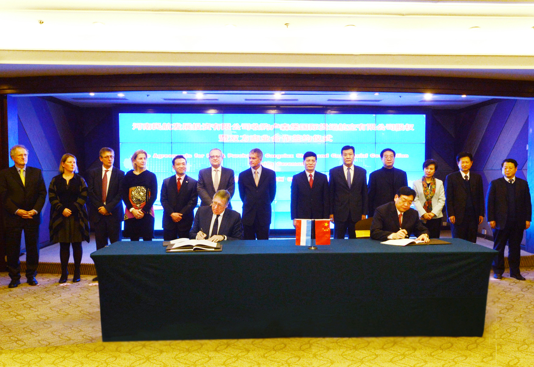 On the afternoon of January 14th, Henan Civil Aviation Development and Investment Co.,Ltd (hereinafter referred to as HNCA) acquired the equity of Cargolux Airlines International (hereinafter referred to as CV), and business corporation signing ceremony held in Zhengzhou. This marks that the world-class all cargo airline based company officially settled down in Zhengzhou Airport Economic Comprehensive experimental area. The corporation has set up “the air of Silk Road”, which establish the connection between China and Europe, and add new heights for the opening up in Henan Province.