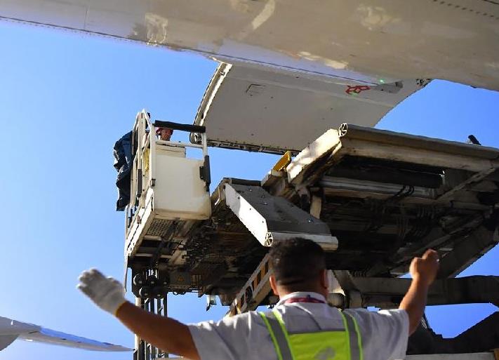 Photo prise le 1er ao?t 2023 montrant le personnel de la gare aérienne de Zhengzhou de Cargolux Airlines International décharger des marchandises sur l'aéroport international de Zhengzhou Xinzheng, dans la province du Henan (centre de la Chine). (Xinhua/Li Jianan)