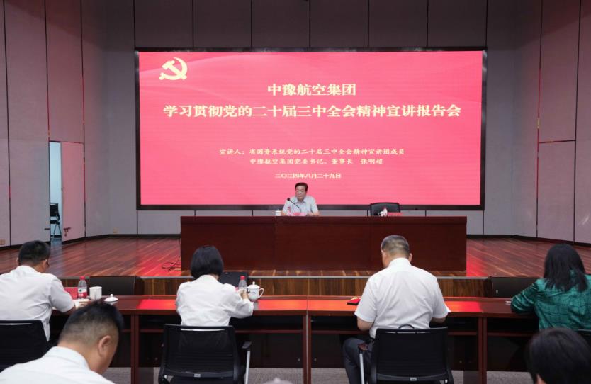8月29日,按照省委和省政府國資委黨委部署,中豫航空集團(tuán)舉行學(xué)習(xí)貫徹黨的二十屆三中全會(huì)精神宣講報(bào)告會(huì)。省國資系統(tǒng)宣講團(tuán)成員,中豫航空集團(tuán)黨委書記、董事長張明超作宣講報(bào)告,黨委副書記、總經(jīng)理、副董事長柳建民主持會(huì)議,集團(tuán)領(lǐng)導(dǎo)班子在鄭成員、中層管理人員、青年員工代表約300人參會(huì)。