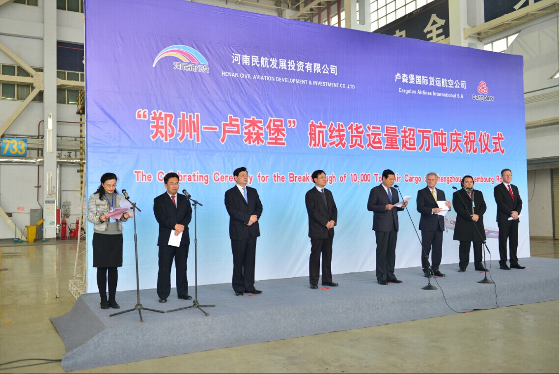 河南省副省長趙建才參加儀式并致辭,他指出,“鄭州-盧森堡”國際貨運航線架起了橫貫中歐大陸的“空中絲綢之路”?!耙宦凤w跨中歐,天塹變通途”,截至今日,該航線累計貨運量已突破萬噸,為鄭州國際機場貨運量的快速提升作出了突出貢獻!這一成績的取得,是河南省與盧貨航優(yōu)勢互補、合作共贏的成功典范,更是“雙樞紐”戰(zhàn)略推動實驗區(qū)發(fā)展的生動實踐。當前,鄭州航空港經(jīng)濟綜合實驗區(qū)發(fā)展態(tài)勢良好,希望盧貨航與河南航投搶抓實驗區(qū)戰(zhàn)略機遇,不斷拓寬合作領域,豐富合作內(nèi)容,加快推動合資貨航組建和飛機維修基地建設,積極培育參與國際分工合作新優(yōu)勢,努力促進鄭州與盧森堡乃至歐亞之間的經(jīng)貿(mào)合作和人文交流,為建設鄭州航空港經(jīng)濟綜合實驗區(qū)做出新的更大的貢獻。