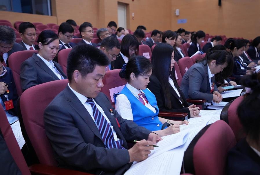 集團黨委書記、董事長張明超代表集團黨委向大會作報告,與會代表在現(xiàn)場認真聆聽。