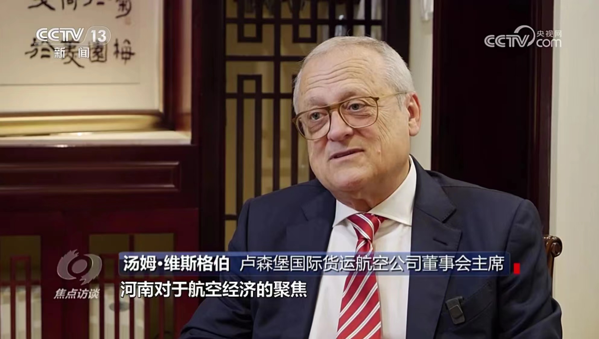 10月11日,央視《焦點訪談》播發系列報道“絲路同行”第一集——雙向奔赴的繁榮之路。報道中說,“一帶一路”倡議的提出,讓河南明確了突破區位限制、向藍天要效益的開放思路。通過采訪河南航投集團黨委書記、董事長張明超和盧森堡貨航董事會主席湯姆·維斯格伯、總裁兼CEO理查德·福森,報道回顧了鄭盧“空中絲綢之路”十年探索實踐和豫盧之間的友好情誼。節目評論道:“(河南航投與盧森堡貨航)之間早已超越了生意伙伴這一簡單的關系,多年的合作讓鄭州與盧森堡兩個航空樞紐之間的互聯互通真正實現了彼此雙方互利共贏和美美與共。這一切都在詮釋著‘一帶一路’倡議的核心要義。”